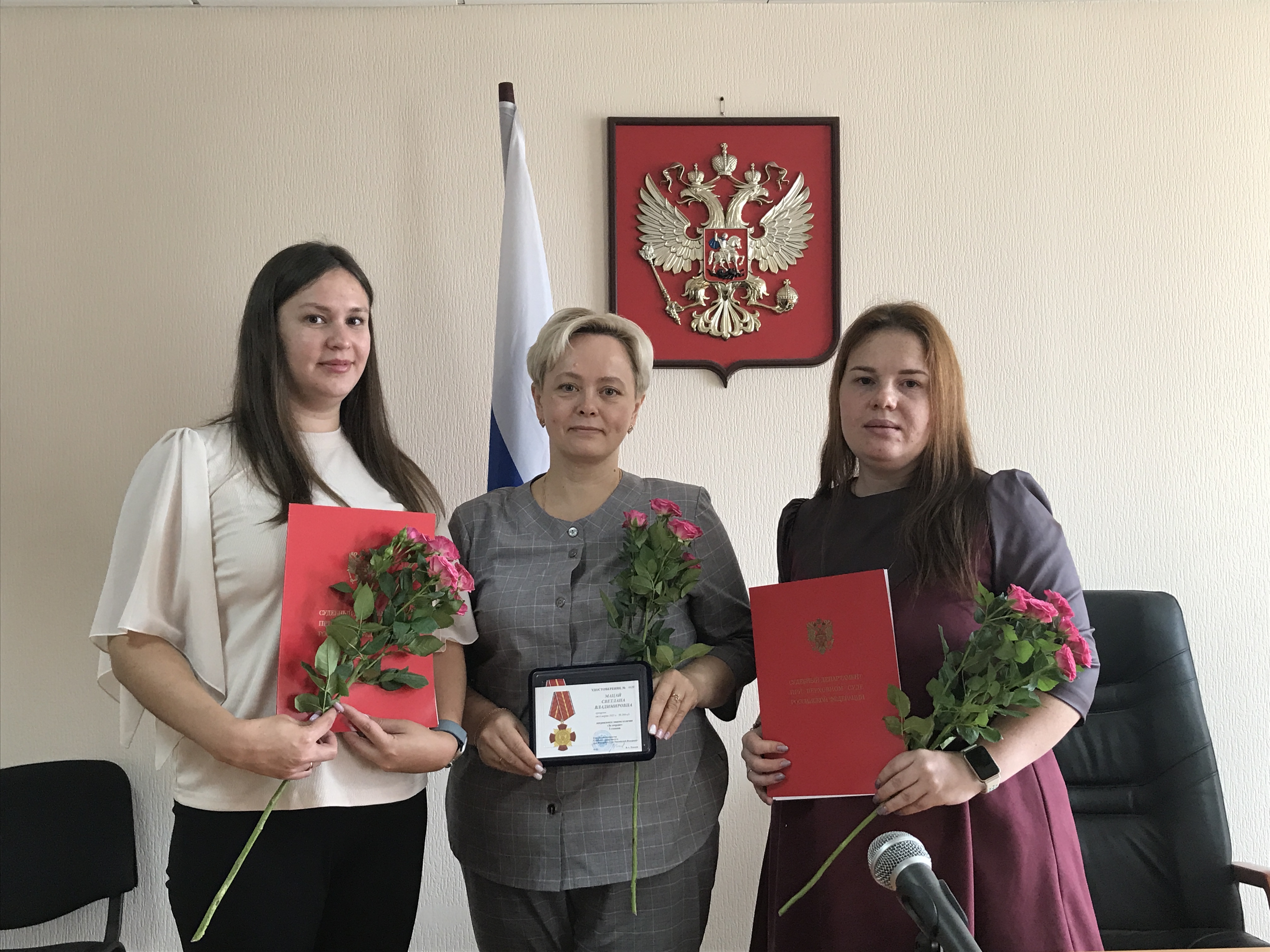 В Ханты-Мансийском районном суде состоялось торжественное собрание судей и работников аппарата. Председатель суда Гавриш В.А. поздравил с Днем Государственного флага России. Кроме того, за высокие результаты в деле организационного обеспечения деятельности федеральных судов общей юрисдикции, добросовестное исполнение должностных обязанностей и личный вклад в укрепление органов правосудия вручены Благодарности Генерального директора Судебного департамента при Верховном Суде Российской ФедерацииА.В. Иванова помощнику судьи Ахияровой М.М., начальникуотделаГилевой В.Д., секретарю судебного заседания Мукминовой А.М., судьям Клименко Г.А., Костиной О.В. За значительный в вклад в развитие судебной системы, всестороннее содействие в укреплении и совершенствовании правосудия в Российской Федерации награждена знаком отличия Судебного департамента при Верховном Суде Российской Федерации «За усердие» Iстепени начальник отдела Мацай С.В.